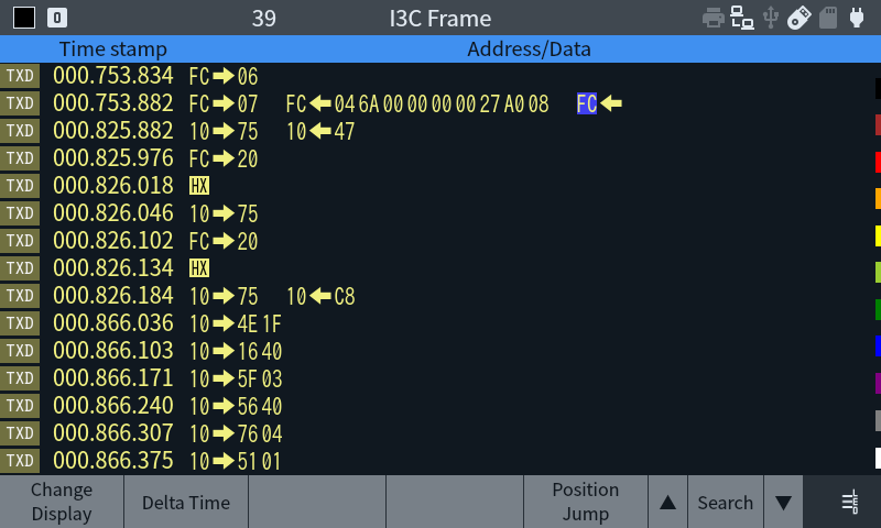 It is now possible to monitor I3C communication, which is expected to become a next generation standard for inter-chip communication. I3C is a communications standard that extends I2C, and is capable of high-speed communication at clock speeds of up to 12.5MHz using a two-wire system while maintaining backward compatibility with I2C. As with I2C measurements, monitoring is performed by connecting to the LE-8500X(R)-RT's TTL (1.8V/2.5V/3.3V/5V level) measurement port.