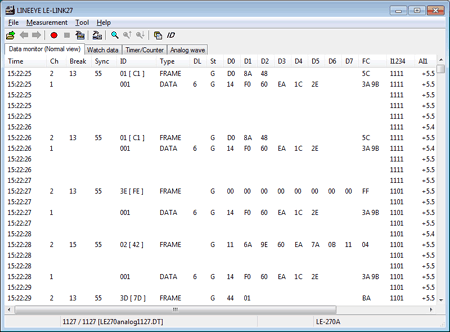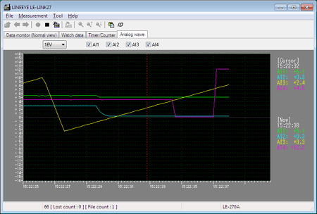 在过去的监听模式,捕获CAN/LIN数据的同一时机才能测定外部4个信道的电压,一共记录通信数据和电压数据。 使用这个新版本,如输入4道的模拟信号记录器一样,能够以事先指定的采样周期量测外部4信号。< 模拟测定模式表示例 >采样模拟电压的同时,能够记录上一次采样时以后接受的最新通信数据,有助于分析外部信号变动和通信数据之间的互动。